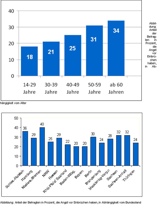 Gut ein Viertel (27 Prozent) der Deutschen haben Angst, dass Einbrecher ihr Hab und Gut stehlen. Frauen sind mit 34 Prozent ängstlicher als das starke Geschlecht (19 Prozent) und ältere Menschen im Alter ab 60 Jahren sind mit 34 Prozent ängstlicher als jüngere Jahrgänge. Was die Berufsgruppen betrifft, so sind Selbständige/Freiberufler/ Landwirte (38 Prozent) sowie Rentner (33 Prozent) die ängstlichsten Gruppen. Dem gegenüber sehen Arbeiter (16 Prozent) und Auszubildende (19 Prozent) keine große Gefahr.