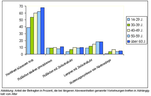 71 Prozent der Befragten treffen bei längeren Abwesenheiten von zu Hause – wie dem anstehenden Sommerurlaub – besondere Vorkehrungen. Besonders bemüht sind die Beamten (84 Prozent) und die Rentner (76 Prozent). Über alle Befragten gesehen küm-mern sich bei 58 Prozent der Befragten die Nachbarn um das eigene Zuhause. Gleichermaßen wie die Angst vor Einbrüchen im Alter steigt, nehmen auch die Vorkehrungen zu: